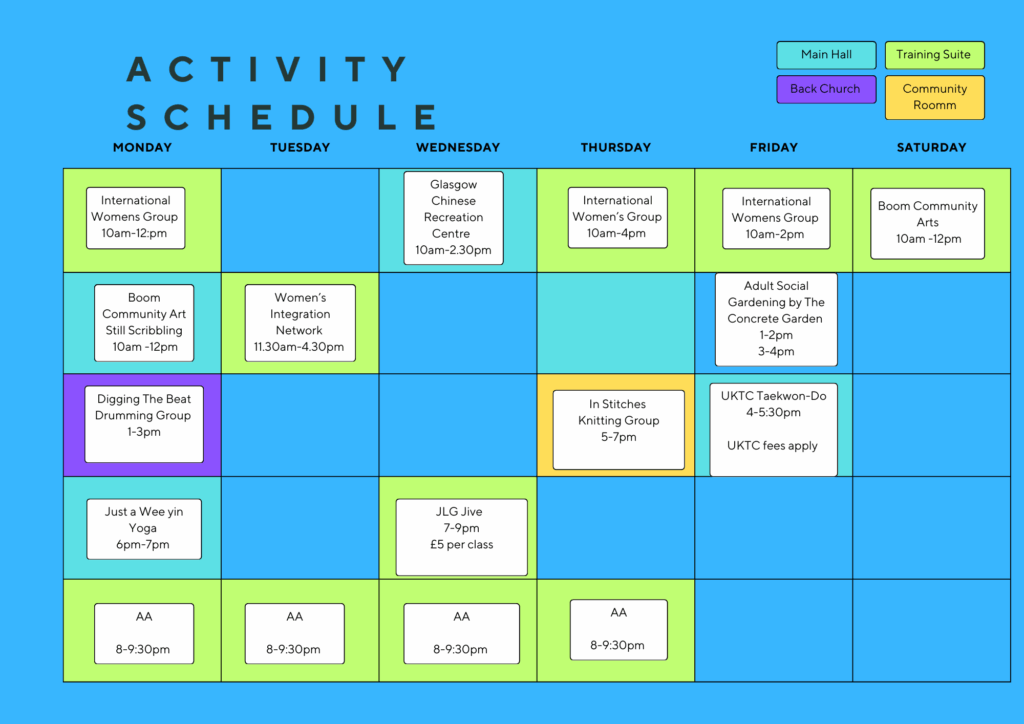 Below you can view our current booking and activities for the month. If you click on specific events you will be able to access more information. If you would like to a book any of our available spaces throughout the week, please Contact Us